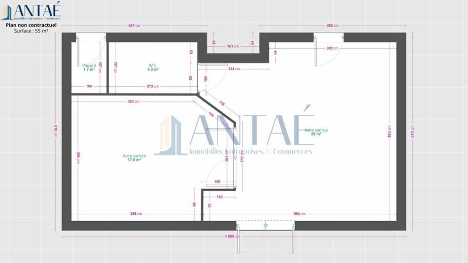 Local commercial d'environ 55 m² séparé en 2 espaces et un sanitaire.