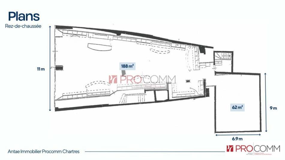 Une boutique climatisée d'environ 250 m² de plain pied proposant une façade de 9 mètres linéaires offrant une excellente visibilité commerciale.