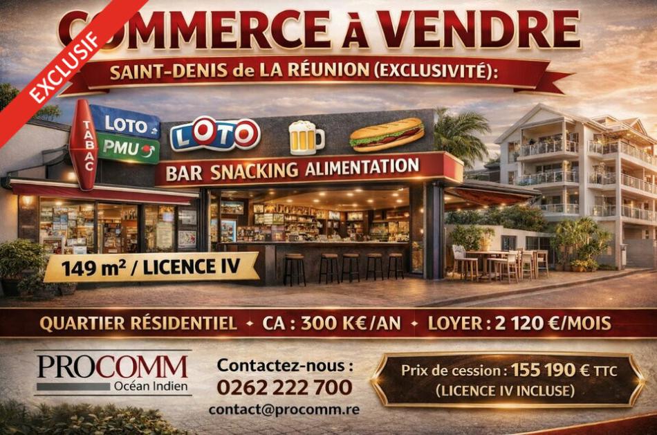 Contact direct : PROCOMM Océan Indien - 0262 222 700 - contact@procomm.re - informations complémentaires sur simple demande (Réf. 974F840770) - Prix de cession (Honoraires d'Agence Inclus) : 155 190 € TTC (LICENCE IV incluse).